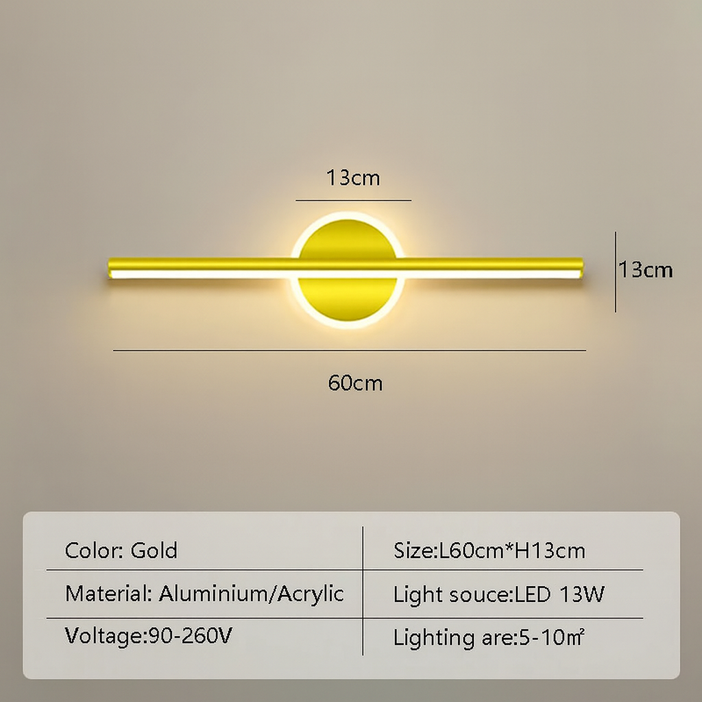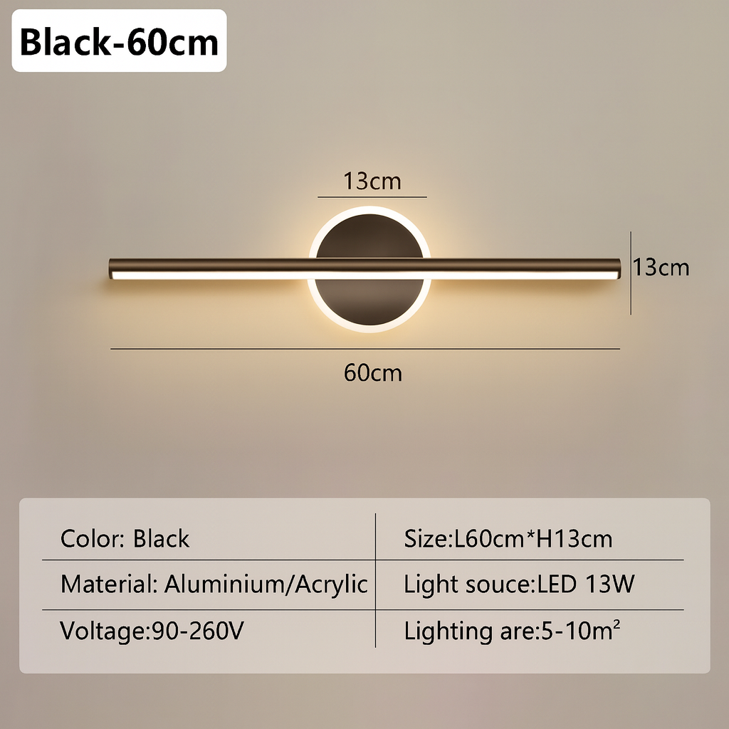 Attribute Details Style Modern / Minimalist / Bathroom LED Materials Aluminum Alloy + Acrylic Diffuser Light Source Integrated LED (Non-replaceable) Available Sizes 40cm / 60cm Colors Black / Gold Voltage 90–260V AC Power Source Hardwired AC Use Areas Bathroom, Vanity, Toilet Mirror, Hallway, Bedroom Mounting Type Wall-mounted (horizontal above mirror or accent wall)