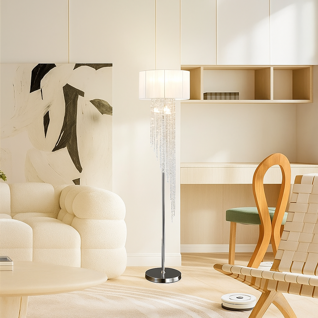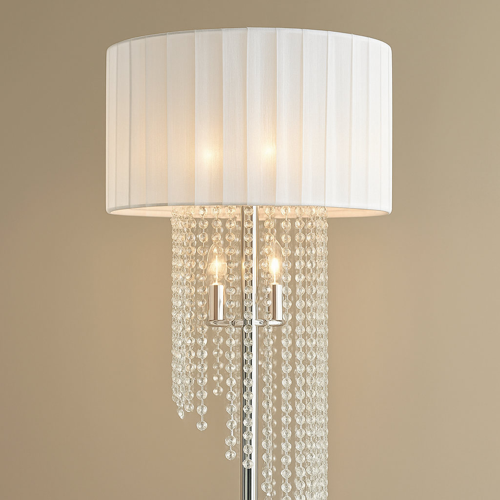 Add timeless elegance and ambient glamour to your home with this 65.75-inch floor lamp, featuring a sheer white drum shade and delicate rain crystal accents. Designed to cast a soft, glowing light while reflecting subtle sparkle, this lamp is perfect for creating a sophisticated atmosphere in the living room, bedroom, or reading nook.