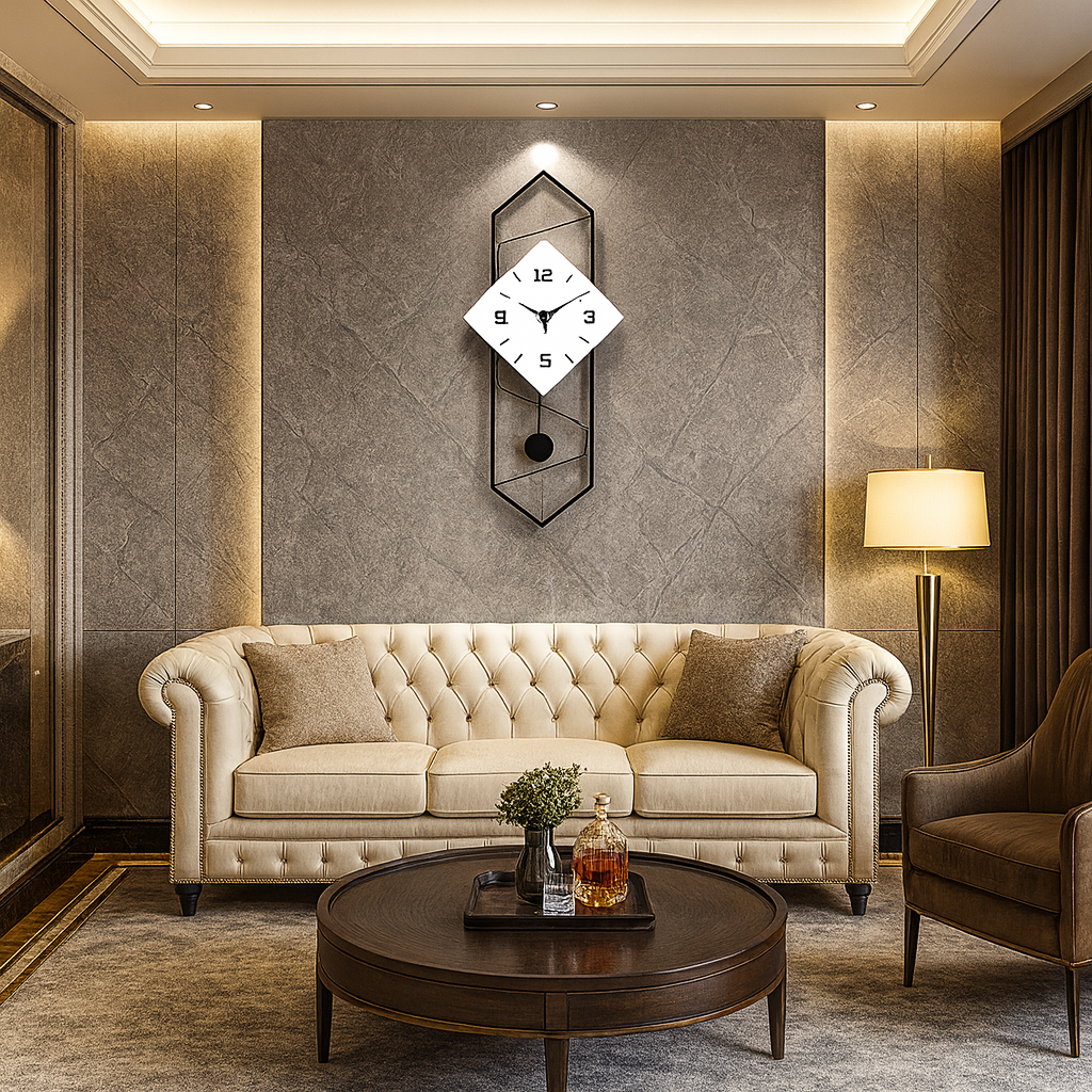 Powered by a silent quartz mechanism, it ensures accurate, non-ticking timekeeping for a serene atmosphere. The gently swinging pendulum adds dynamic visual interest, making it more than just a timepiece — it's a moving sculpture for your wall.