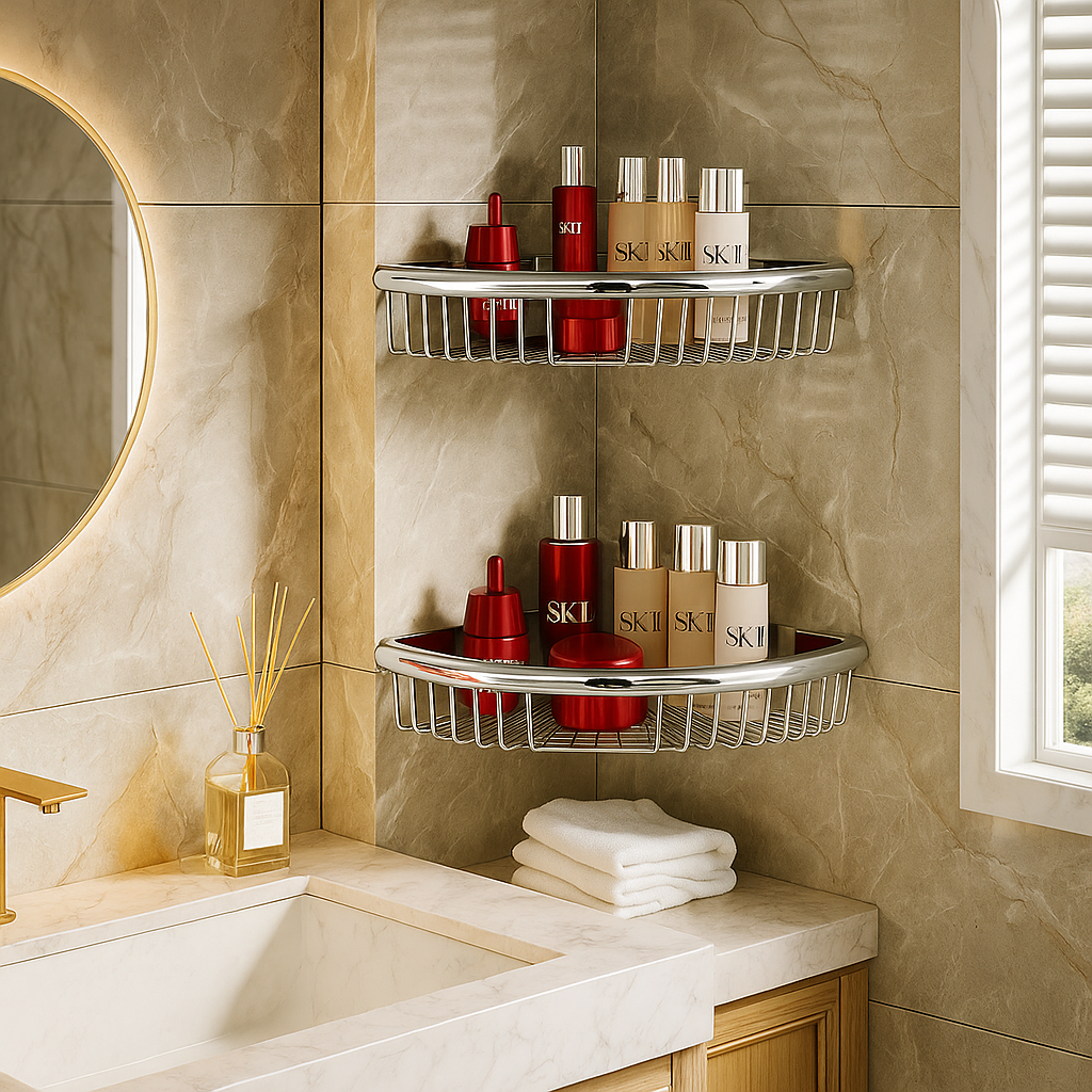 The Lucca Dispenser Organization brings refined elegance to everyday organization. Crafted from premium aluminum alloy with a copper-gold finish, this non-perforated triangular rack offers durability, style, and easy installation—no drilling required.