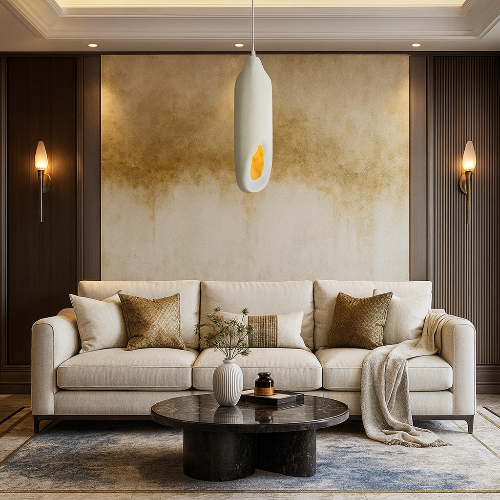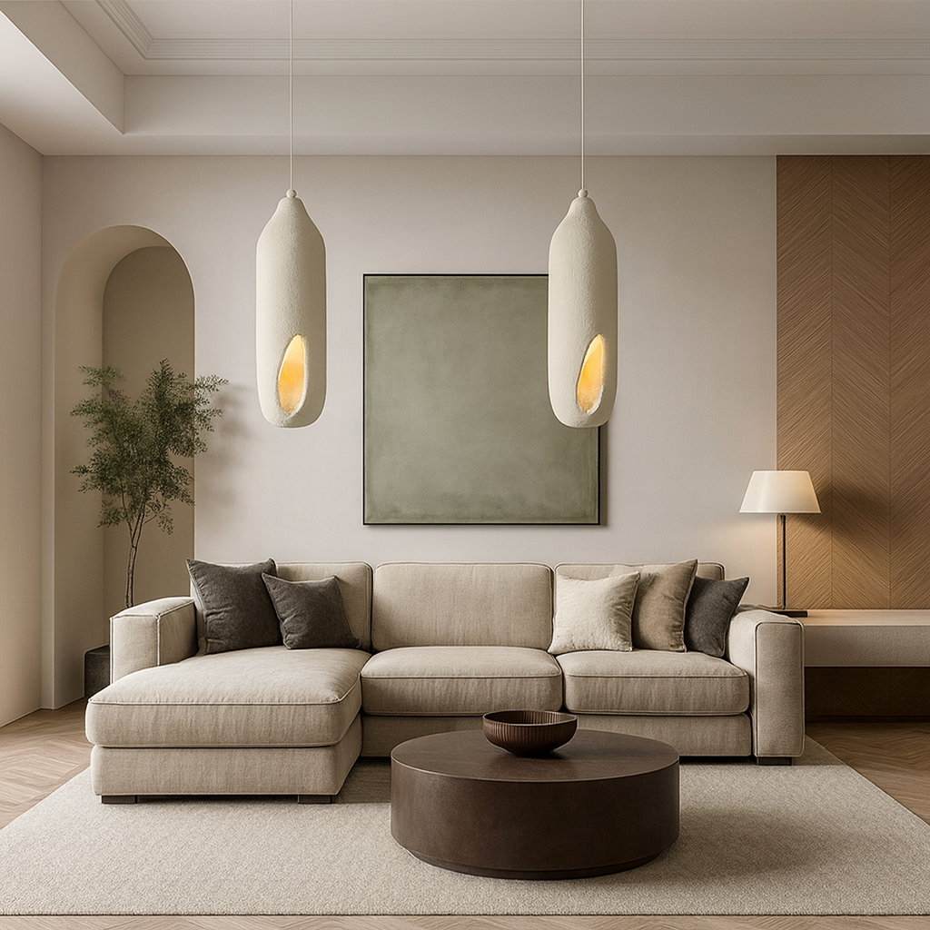 Wabi-Sabi aesthetic: sculptural “wind” form with artisanal texture.