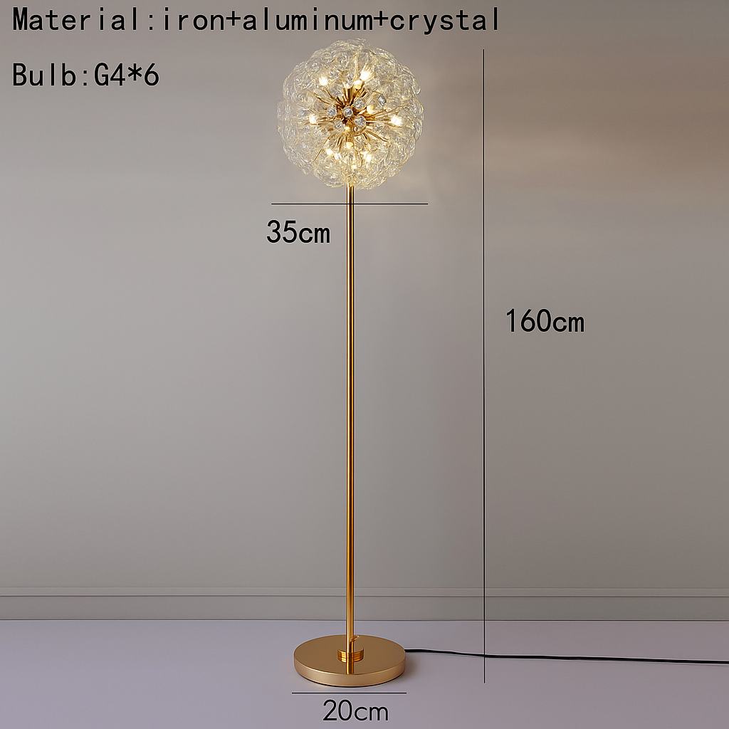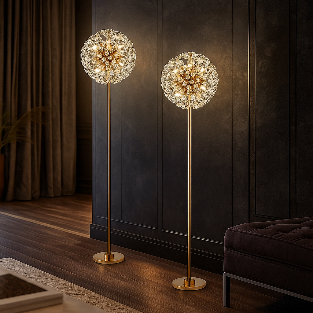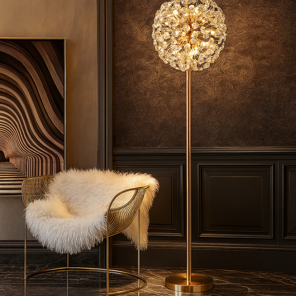 Its gold electroplated metal frame adds warmth and richness, making it an eye-catching decorative piece even when switched off. The Soléra lamp delivers a glowing interplay of light and crystal, ideal for luxury foyers, living rooms, VIP lounges, hallways, and designer bedrooms.
