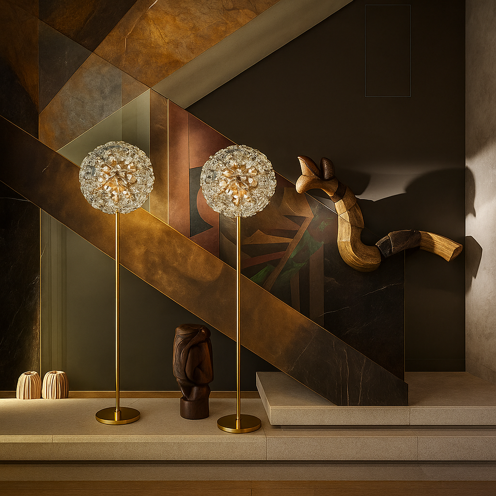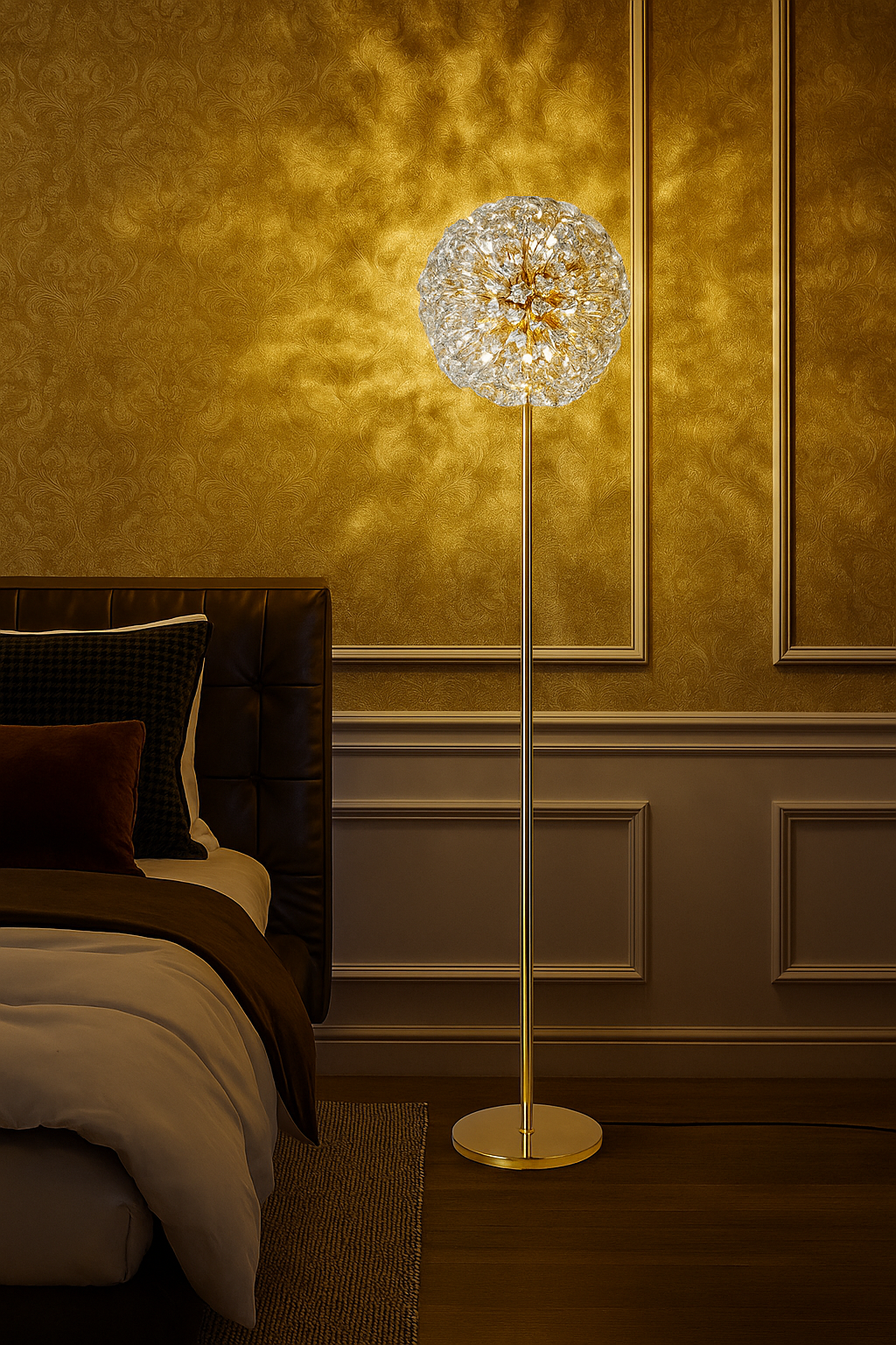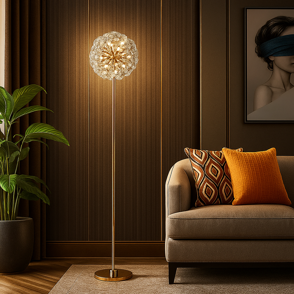Its gold electroplated metal frame adds warmth and richness, making it an eye-catching decorative piece even when switched off. The Soléra lamp delivers a glowing interplay of light and crystal, ideal for luxury foyers, living rooms, VIP lounges, hallways, and designer bedrooms.
