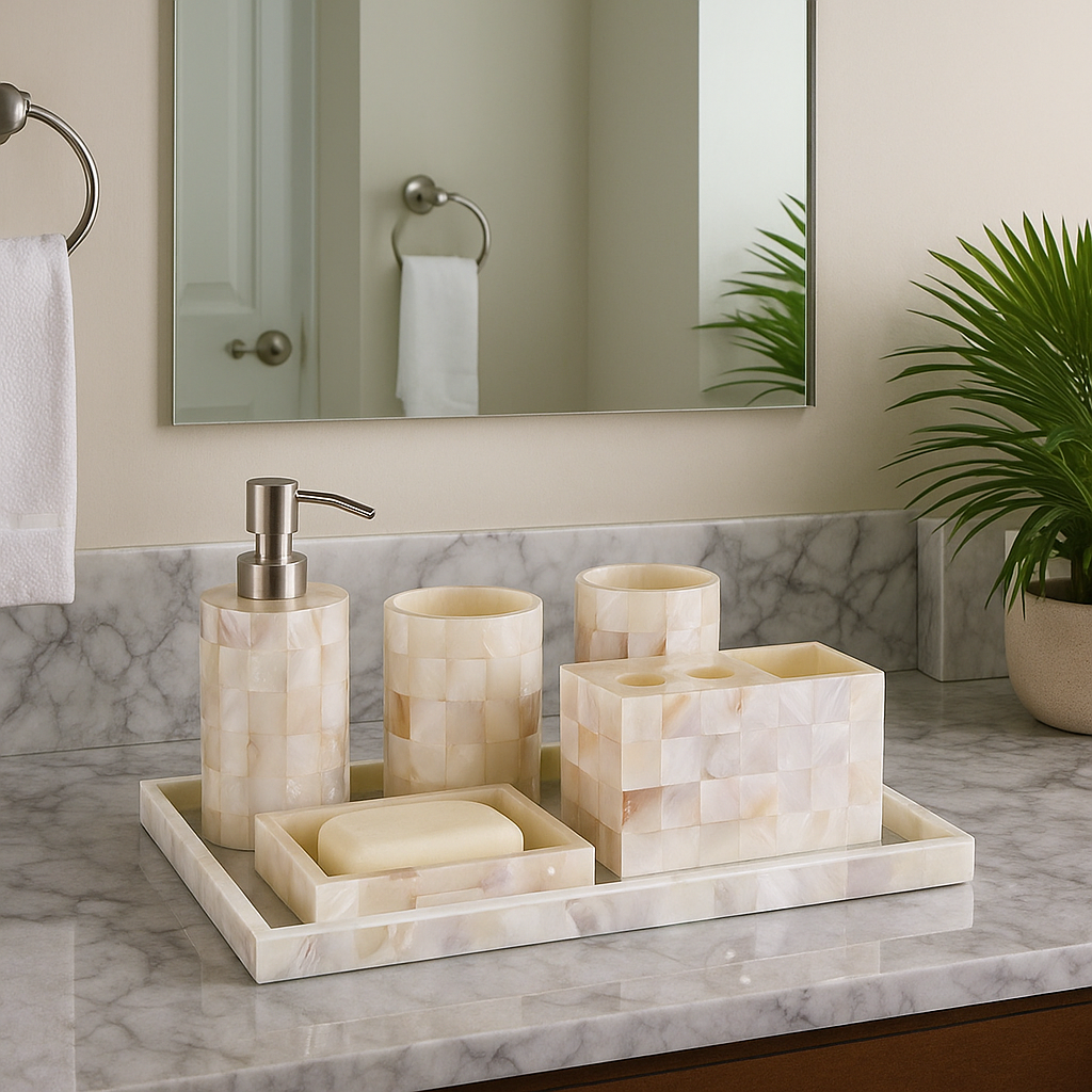 Add a refined, cohesive look to your bathroom with this luxury 5-piece resin set. The creative sculpted design provides a timeless appeal, while the neutral tones effortlessly complement any décor—from classic to contemporary. Each item is crafted with durable resin for lasting elegance, making it a stylish yet functional upgrade for your home.
